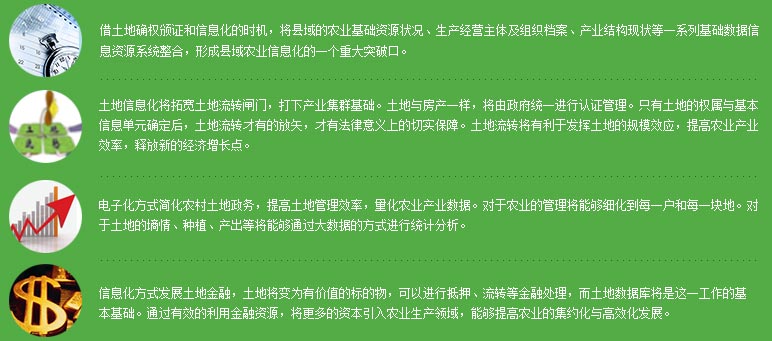 国家推动的土地确权登记,如同90年代的商品房改革,这次通过确权登记确立了农民的财产权,是本次农业改革的灵魂,也将彻底激活农业经济的发展,使其成为带动中国经济增长的新亮点!通过土地确权登记,完成土地信息化,这是农业信息化的第一步,接着通过火狐电竞·(中国)官方网站应用平台建设,有效地把县域农业生产要素和信息整合起来,形成一个对外的接口,这样才能高效融入互联网行业的发展,利用互联网思维改造当地农业,加速推进县域农业产业集群的发展,增强县域经济的核心竞争力!